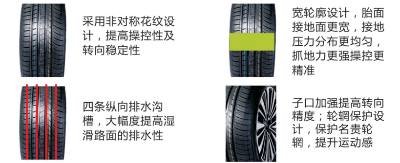 胎面非對稱花紋,提供優(yōu)異干濕地性能,花紋變節(jié)距設(shè)計,降低輪胎噪音